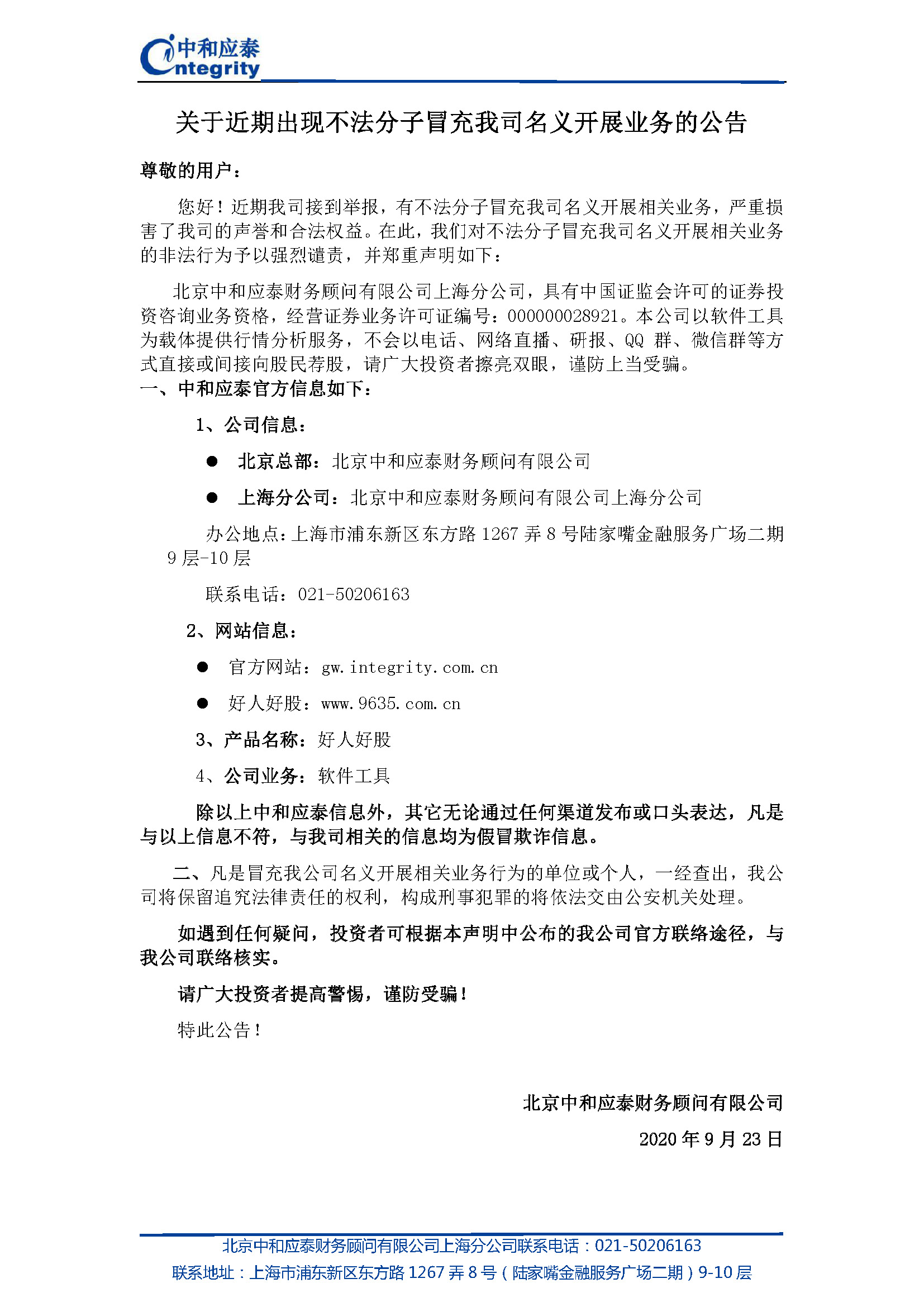 除以上中和应泰信息外,其它无论通过任何渠道发布或口头表达,凡是与以上信息不符,与我司相关的信息均为假冒欺诈信息。